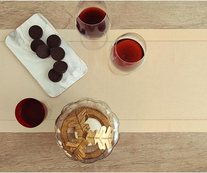 Solino Home Linen Hemstitch Table Runner 60 Inches - 100% Pure Linen Beige Table Runner 14 x 60 Inch Ideal for Dresser and Coffee Tables - Christmas, New Year - Classic Hemstitch