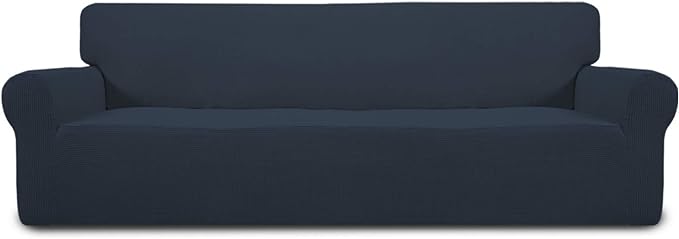 Easy-Going Stretch 4 Seater Sofa Slipcover 1-Piece Sofa Cover Furniture Protector Couch Soft with Elastic Bottom for Kids, Polyester Spandex Jacquard Fabric Small Checks Dark Blue