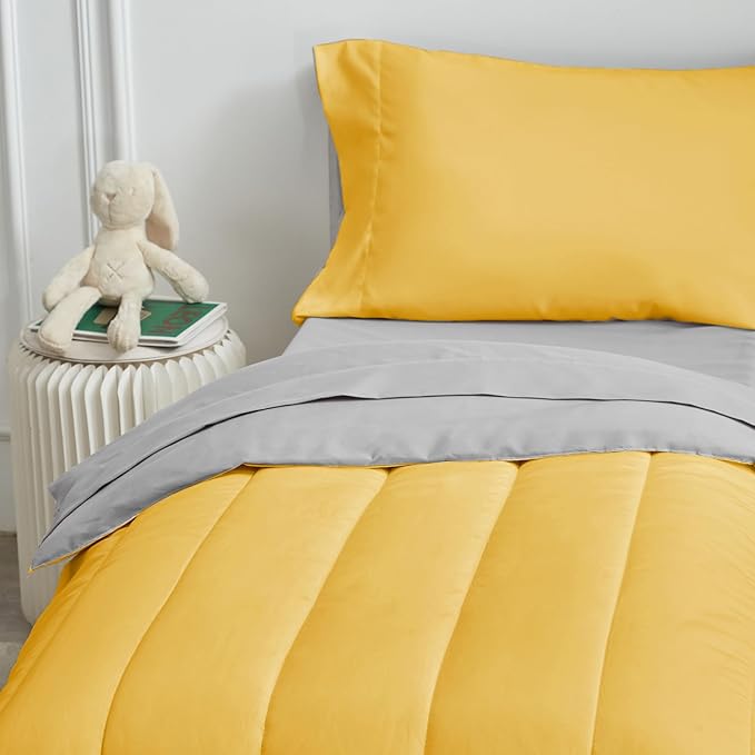 - What You Get: Yellow and Gray 4-Piece Toddler Bedding Set includes: 1 Yellow reversible comforter (42x57inch), 1 reversible pillowcase (20" x 30"), 1 Gray flat top sheet (45" x 60") and 1 fitted bottom sheet (28" x 52" x 8"). All pieces are measured to fit a standard size toddler bed