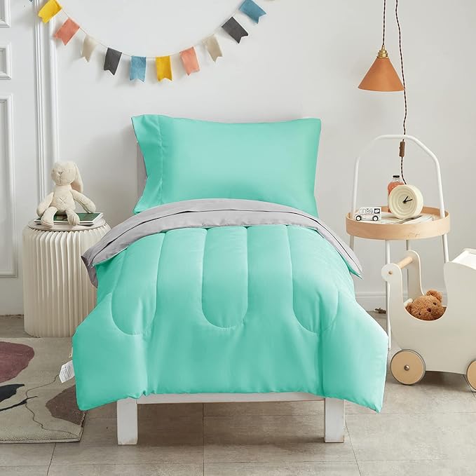 UOZZI BEDDING 4 Pieces Toddler Bedding Set Ultra Soft and Breathable Toddler Sheet Set - Includes Comforter, Flat Sheet, Fitted Sheet and Pillowcase - Teal/Green & Gray