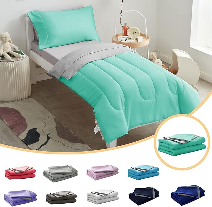 - What You Get: 4-Piece Toddler Bedding Set includes: 1 reversible comforter (42x57inch), 1 reversible pillowcase (20" x 30"), 1 flat top sheet (45" x 60") and 1 fitted bottom sheet (28" x 52" x 8"). All pieces are measured to fit a standard size toddler bed