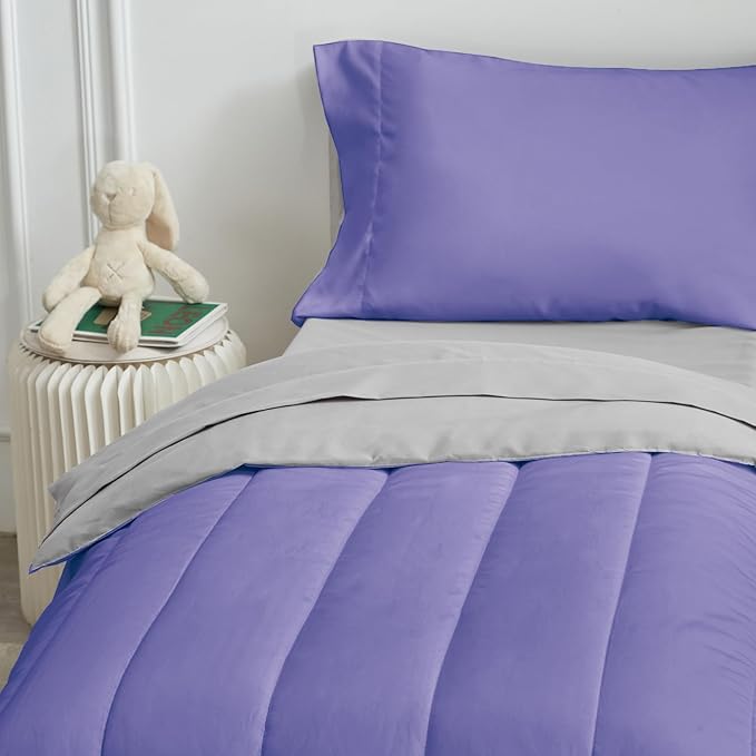 UOZZI BEDDING 4 Pieces Toddler Bedding Set Ultra Soft and Breathable Toddler Sheet Set - Includes Comforter, Flat Sheet, Fitted Sheet and Pillowcase - Purple & Gray