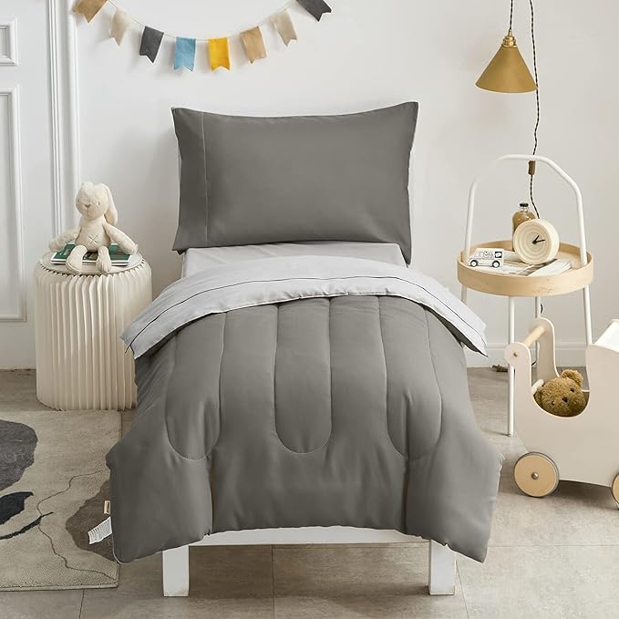 UOZZI BEDDING 4 Pieces Toddler Bedding Set Ultra Soft and Breathable Toddler Sheet Set - Includes Comforter, Flat Sheet, Fitted Sheet and Pillowcase - Dark Gray & Gray