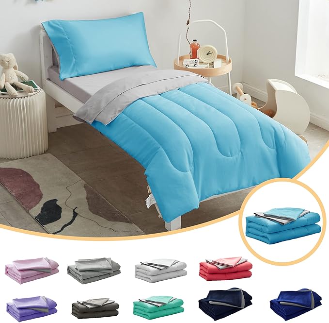 - What You Get: 4-Piece Toddler Bedding Set includes: 1 reversible comforter (42x57inch), 1 reversible pillowcase (20" x 30"), 1 flat top sheet (45" x 60") and 1 fitted bottom sheet (28" x 52" x 8"). All pieces are measured to fit a standard size toddler bed