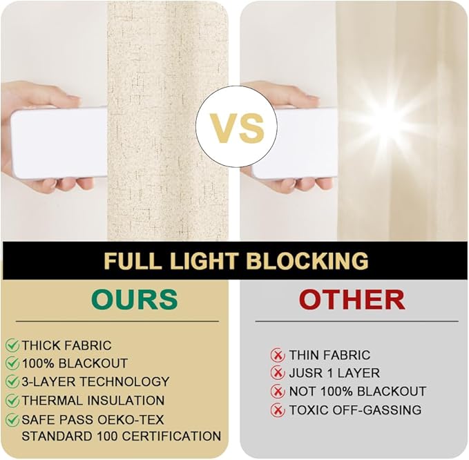 - 100% BLACKOUT CURTAINS: These completely blackout lined curtain panels are thick, durable, and long lasting, definitely can block out 100% bright sunlight and UV ray, keeping room cooler against heat in summer and retaining the room warm in winter, block the wind and reduce the noise. Perfect drapery option for anyone seeking to turn day into night, take a nap, or keep sun glare off your TV