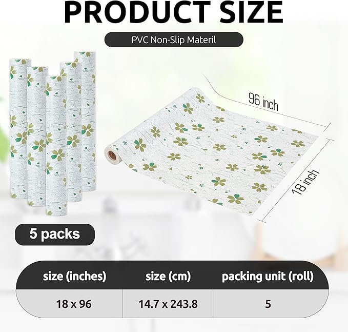 RAY STAR 18X96 Inch Shelf Liner for Kitchen Cabinets, Non-Adhesive Cabinet Liner Washable, PVC Drawer Liner for Dresser Non-Slip Bathroom (Green-Floral)(5 Roll)