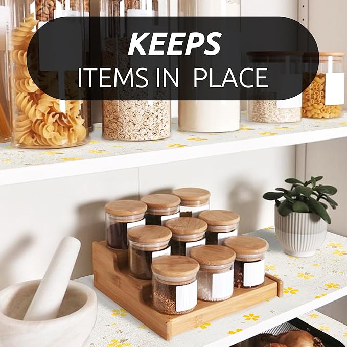 RAY STAR 18X96 Inch Shelf Liner for Kitchen Cabinets, Non-Adhesive Cabinet Liner Washable, PVC Drawer Liner for Dresser Non-Slip Bathroom (Yellow Floral)(1 Roll)