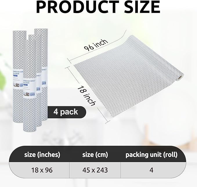 - Details of Shelf Liner - The size of each roll is 18*96 inch, we believe that is perfect wide for the shelves. In addition, it is easy to cut out if you need to modify the size. Moreover, our shelf liner is easy to clean with a towel because it is waterproof and oil-proof.