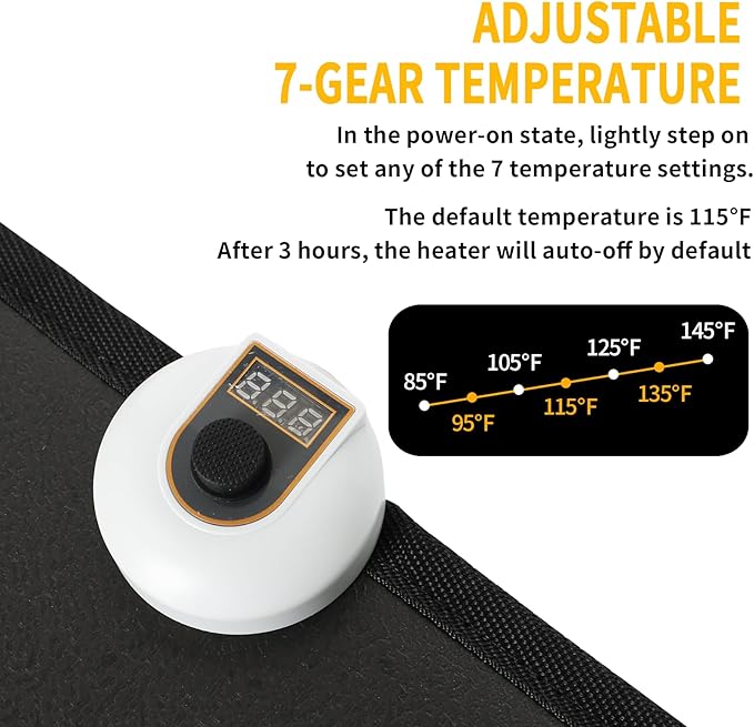 - 【EASY TO USE】Foot switch with temperature display, no need to bend down, just step and hold for more than 2 seconds to switch on or off. Our unique temperature controller makes you able to choose the temperature from 85℉ to 145℉ every 10℉ freely. In the power-on state, lightly step on to set any of the 7 temperatures. It will keep the last setting when powering off then on.