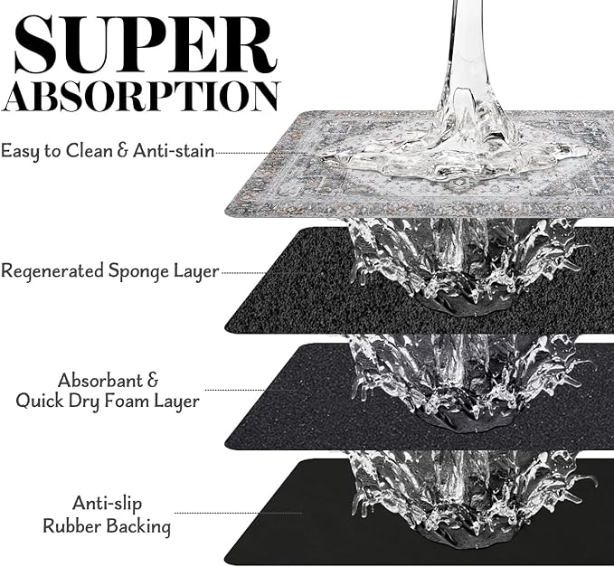- Super Absorption: The dog mat for water bowl can absorb spilled water without leaving traces and dry quick, avoid wetting pet paws even for messy drinkers. And it does not attract pet hair like traditional silicone dog bowl mat.