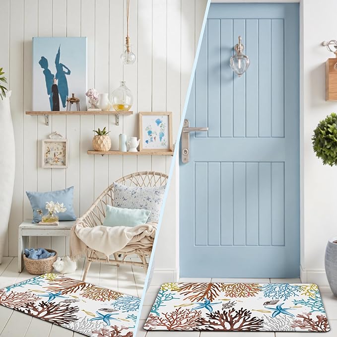 - Beach Theme Functional Aesthetics: Hand-painted watercolor Tropical style coral, starfish, fish motifs, and sea creature blend soft colors for an artistic touch. Bold coral and seashell prints in hues energize your kitchen with a pop of coastal flair. Beach theme anti-fatigue kitchen rugs complement any kitchen style, modern, farmhouse, or industrial, non-skid kitchen mats base integrates seamlessly with surface art, and safety meets style effortlessly.