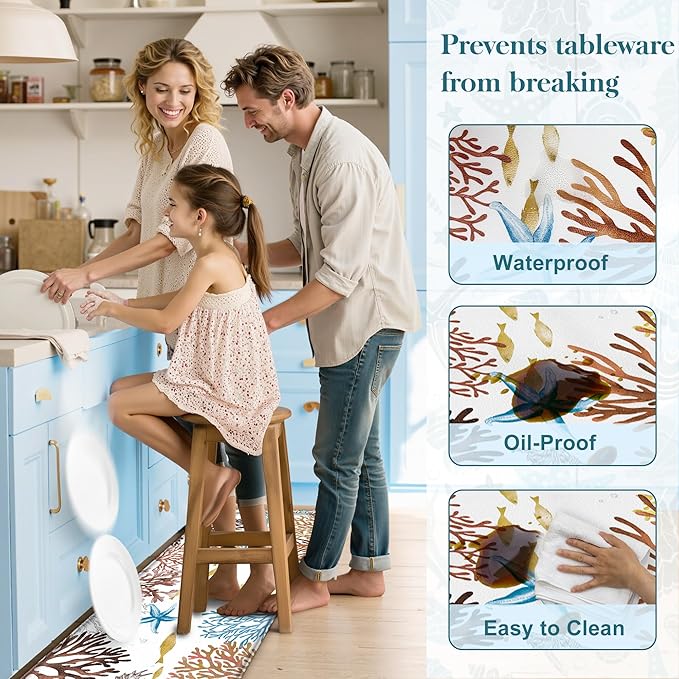 - Versatile Home Decor: sets of 2 with tropical beach theme kitchen rugs non slip and waterproof, easily match your home decor. Coral fish and starfish decor padded foam kitchen mats for floor provide ample support for standing at the kitchen sink, stove, refrigerator, entryway, dishwasher, laundry room, office, bathroom, dining room, classroom while teaching, or any other high-traffic area, whether apartment, school, home, or dorm.