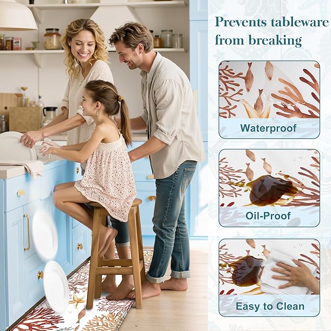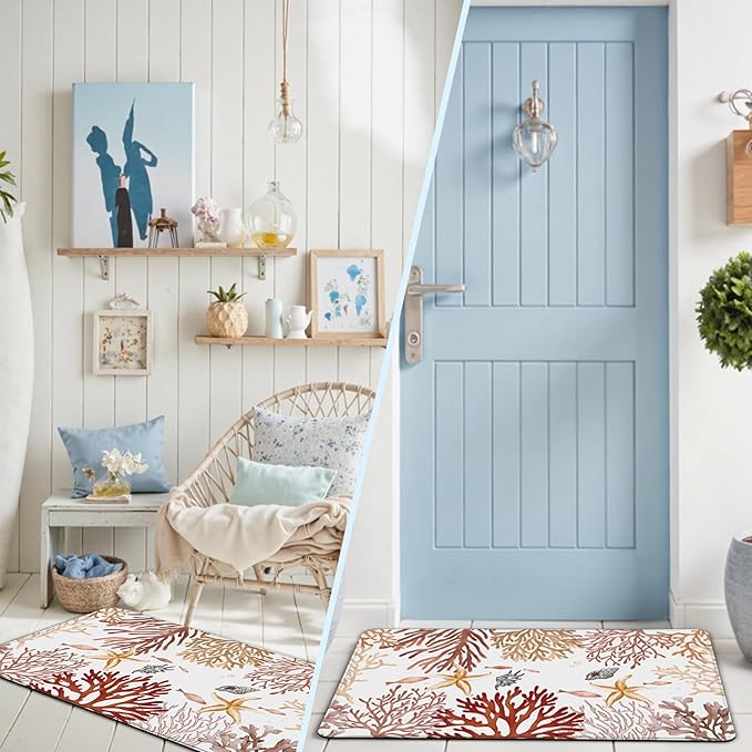 - Beach Theme Functional Aesthetics: Hand-painted watercolor Tropical style coral, starfish, fish motifs, and sea creature blend soft colors for an artistic touch. Bold coral and seashell prints in hues energize your kitchen with a pop of coastal flair. Beach theme anti-fatigue kitchen rugs complement any kitchen style, modern, farmhouse, or industrial, non-skid kitchen mats base integrates seamlessly with surface art, and safety meets style effortlessly.