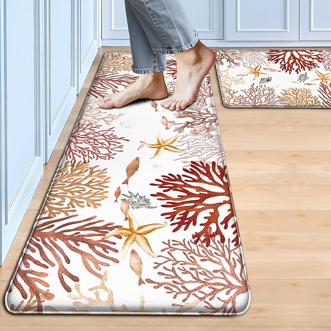 - Anti-Fatigue Kitchen Floor Mats: Includes 2-piece 17.3 x 28-inch + 17.3 x 47-inch 0.4-inch coastal coral kitchen rugs. High-density PVC provides optimal support, keeping you comfortable even after a full day in the kitchen. Feels like walking on clouds. The coastal kitchen mats for floor cushioning layer effectively relieve foot and leg fatigue, making long hours of standing effortless.