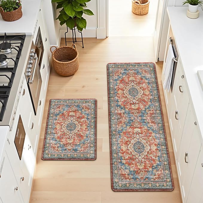 Boho Kitchen Mats for Floor 2 Piece Set Anti Fatigue Cushioned PVC Kitchen Rugs Non Slip Waterproof Farmhouse Mats 2/5 Inch Comfort Standing Mat for Sink, Laundry, 17.3"x47"+17.3"x28", Retro Red